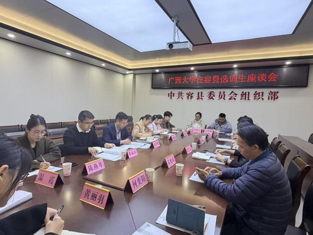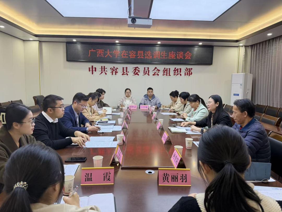 为深入贯彻落实学校党委关于选调生工作的决策部署,持续推进“君武青苗”行动计划,11月26日,院党委书记黄里云带队赴玉林市容县开展选调生调研交流。容县组织部部长夏四根、副部长覃福正出席座谈会,我校9名在容县工作的选调生代表参加交流。