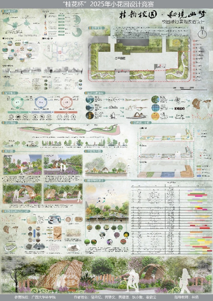 近日,由广西风景园林学会主办的2025年“桂花杯”小花园设计竞赛结果正式揭晓。本届竞赛以桂林理工大学雁山校区校园景观改造为设计场地,聚焦校园空间更新与人文生态融合。广西大学林学院风景园林专业硕士研究生团队表现出色,共荣获研究生组一等奖1项、二等奖1项,充分展现了学院在风景园林设计教育与实践领域的深厚底蕴与人才培养成效。