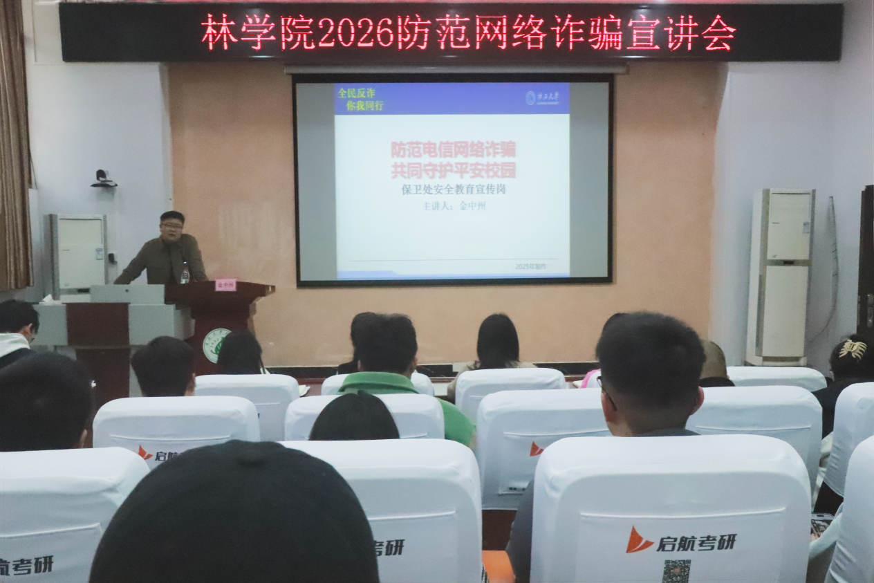 为切实增强师生反诈防骗意识,提升自我保护能力,2026年3月5日下午,广西大学林学院于112报告厅开展电信网络诈骗防范专题讲座,特邀校保卫处金中州老师主讲,学院老师代表、各班级班委到场参加学习。
