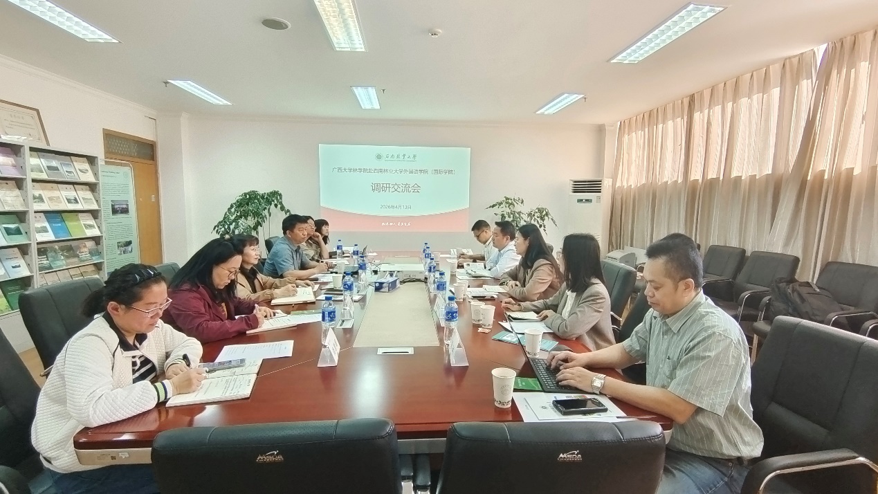 4月13日上午,调研团首先到访西南林业大学外国语学院(国际学院),与该院党委书记姜丽红、院长何新元及留学生管理相关负责人开展座谈交流。何新元院长详细介绍了学院发展历程、机构设置、中外合作办学模式及国际化办学成果;黄里云书记介绍了广西大学及林学院的办学积淀、学科建设、教学科研与社会服务等基本情况。双方围绕中外合作办学提质增效、留学生教育管理、国际交流合作拓展等议题进行深入探讨,互学互鉴经验做法。座谈结束后,调研团参观了该院的院史文化展览墙。