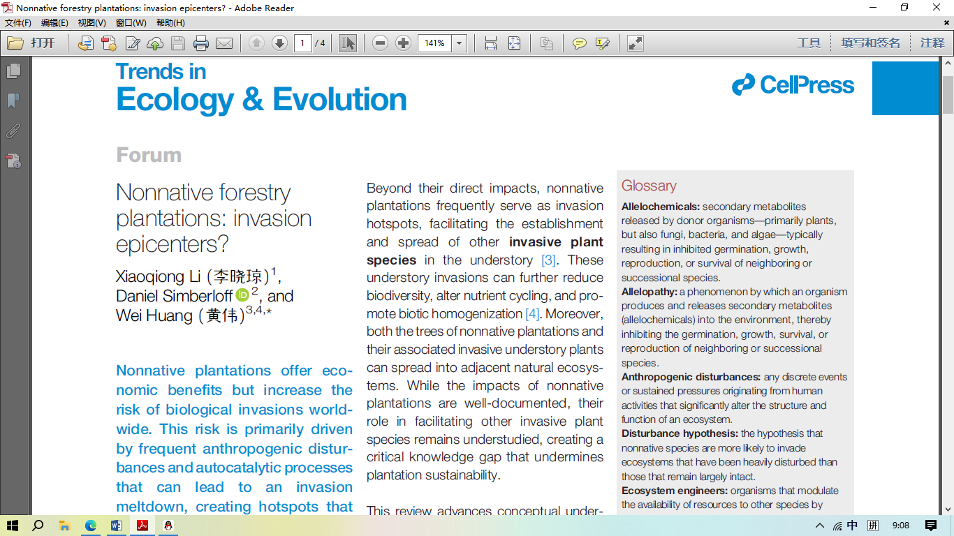 论文信息:Li, X., Simberloff, D., & Huang, W. Nonnative forestry plantations: invasion epicenters? Trends in Ecology & Evolution, 2026.https://doi.org/10.1016/j.tree.2026.01.001